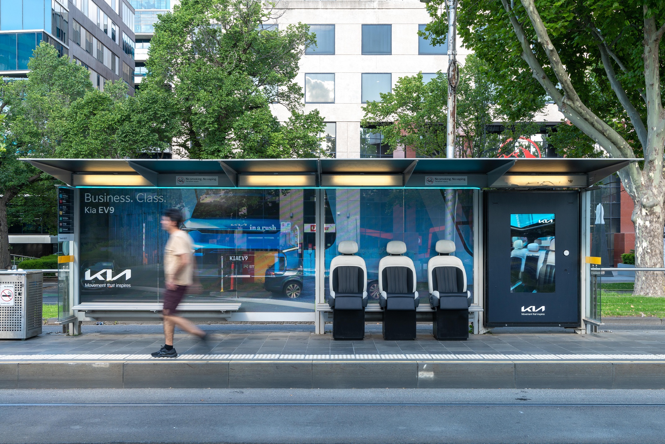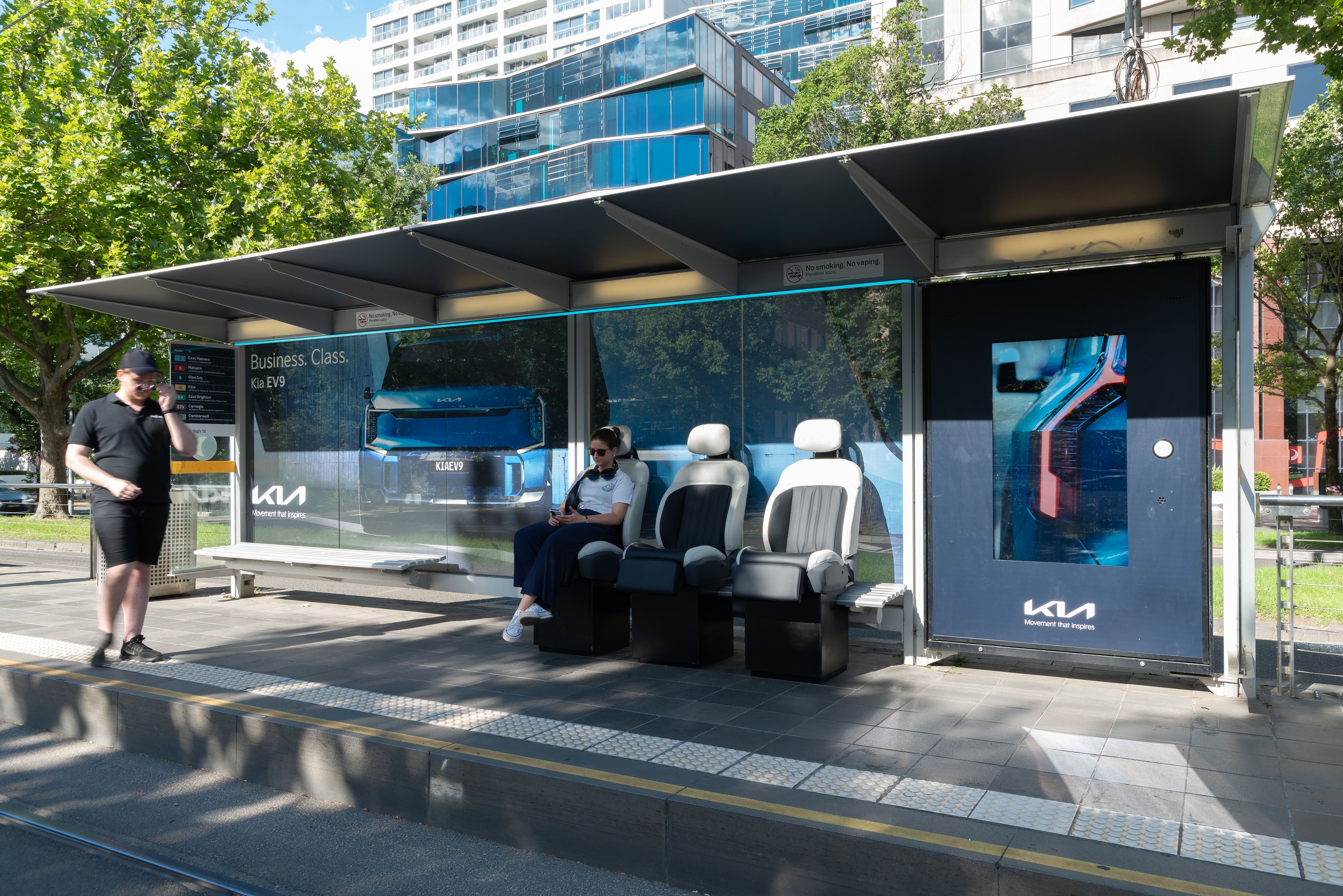 The brand also turned heads in Melbourne with a special build shelter wrap located in front of the training courts at Melbourne Park. Luxurious seats, an audio visual showcase, neon lights and an impactful shelter wrap complete the experience, immersing commuters in the world of Kia.