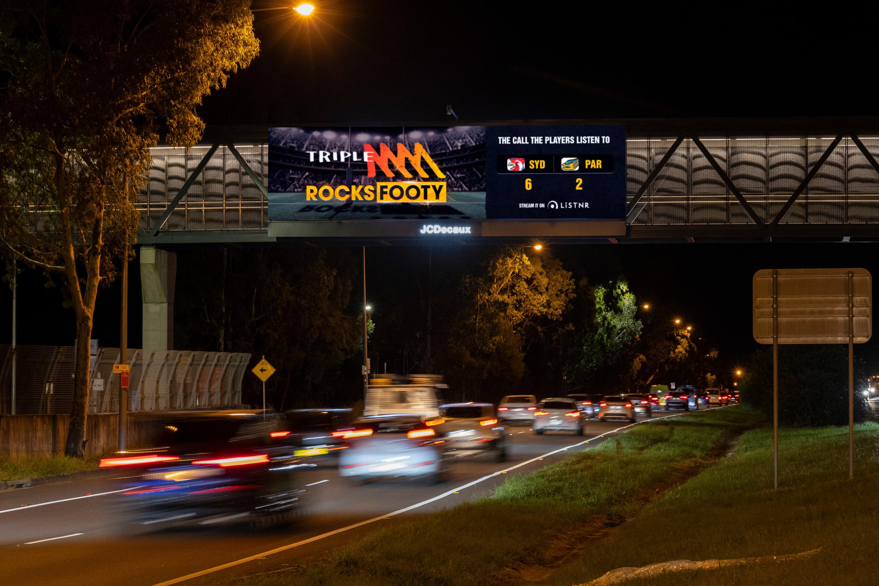 Southern Cross Austereo (SCA) ran a dynamic digital Out-of-Home campaign to drive awareness of its AFL and NRL coverage across the Triple M network and its live streaming of every game on the LiSTNR app. Displayed in New South Wales, Victoria, Queensland, and Western Australia, the campaign utilised JCDecaux Digital Large Format to dynamically serve live footy scores across high-impact sites.