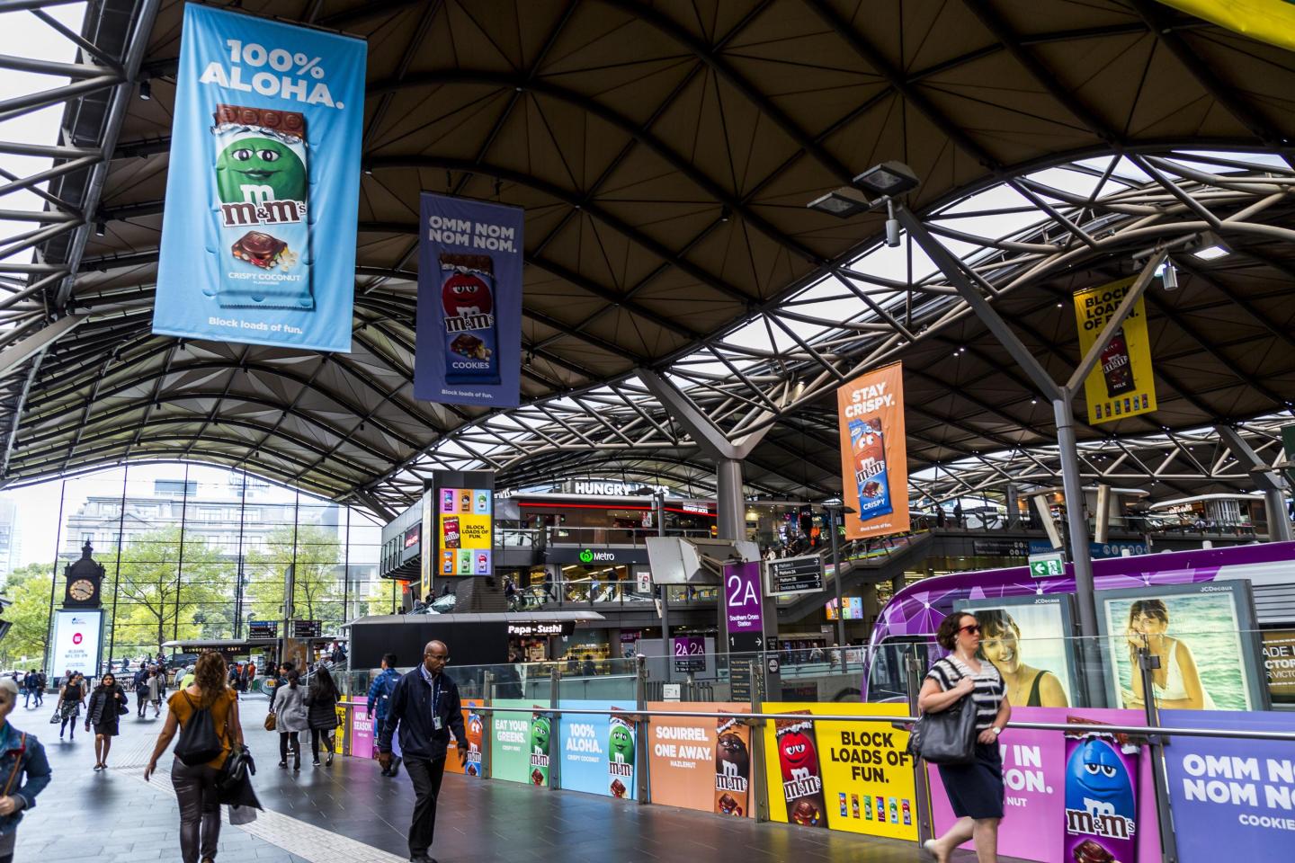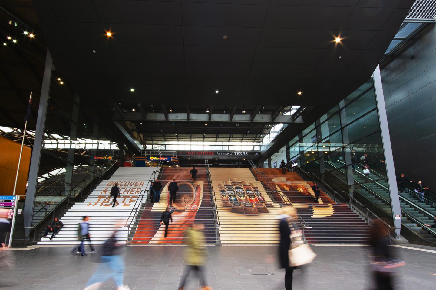 Opportunities to generate talkability and ensure your brand is top-of-mind include: Southern Cross Station platforms and concourse, Bourke Street Bridge, and Bourke Street Stairs.